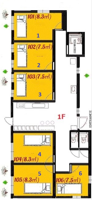 - Room 102: 4.5 Tatami (7.5㎡) - Monthly Rent: 46,000 JPY + Common Fee: 10,000 JPY - Check Room